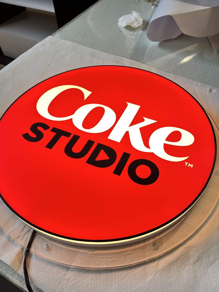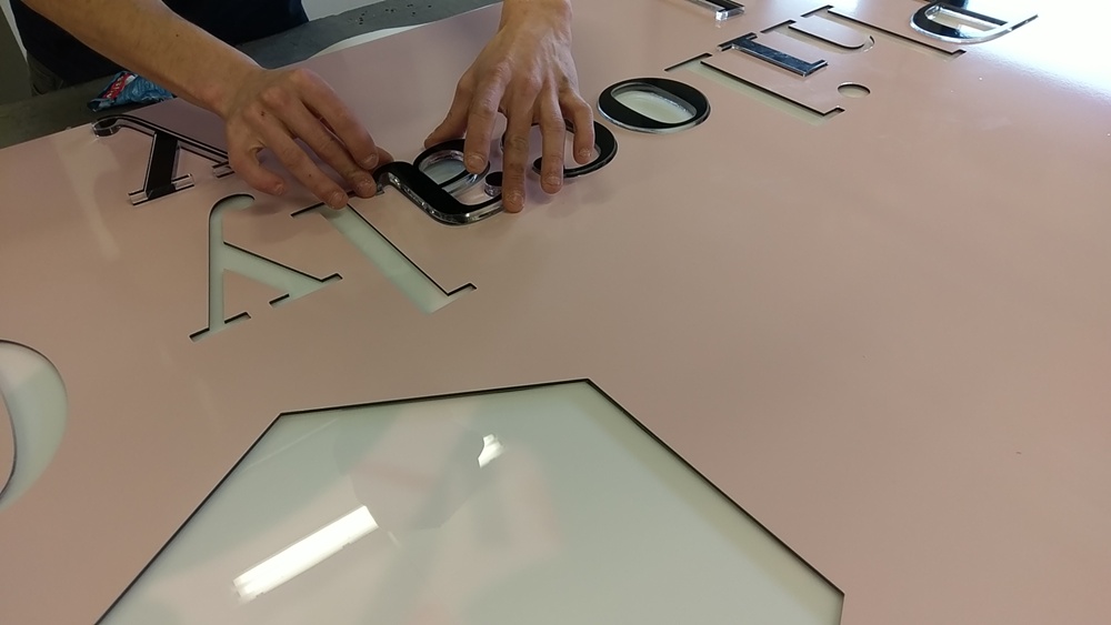 Die Front des Leuchtrahmen wird aus Dibond gefräst, um das gewünschte Logo in der gewünschten Form auszuschneiden. Der ausgeschnittene Teil wird mit Acrylglas gefüllt, das dann beleuchtet wird. Diese Füllung kann entweder durch das Unterkleben des Acrylglases unter die Dibondplatte oder durch das Durchschieben des Acrylglases durch die Dibondplatte erfolgen, was dem gesamten Leuchtkasten einen noch räumlicheren Charakter verleiht.
