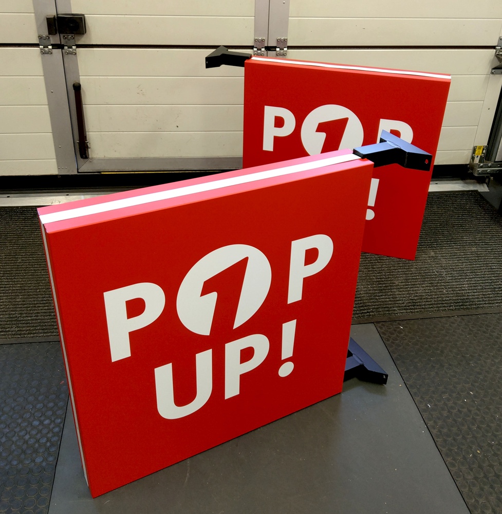 Dieser Leuchtkasten besteht aus Dibond, einem Aluminiumverbundstoff, der aus zwei dünnen Aluminiumschichten und einem Kunststoffkern besteht, sowie einer Aluminiumkonstruktion, auf die das Dibond-Element aufgebracht wird. Dadurch ist er leicht, aber gleichzeitig sehr robust und langlebig.