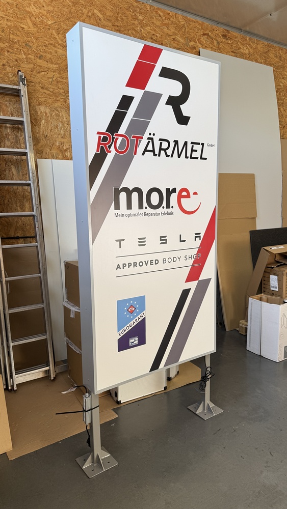 Textil-Werbepylone nutzen homogene LED-Hintergrundbeleuchtung, die die gesamte Fläche gleichmäßig ausleuchtet. Diese Technik sorgt für eine beeindruckende Präsenz, auch bei großen Formaten.